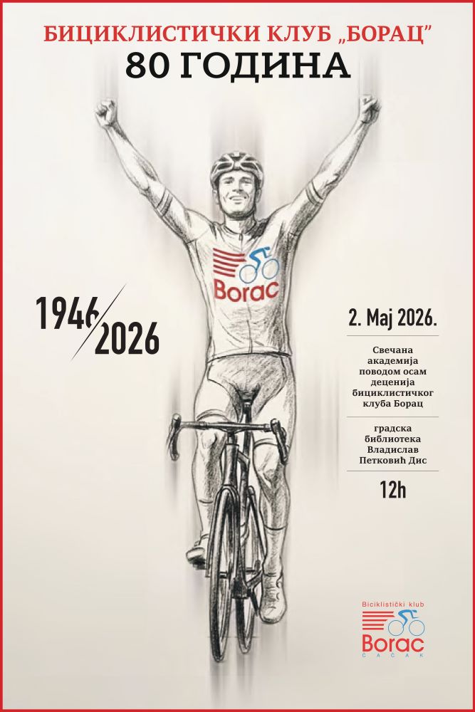 Obeležavanje jubileja počinje u subotu, 2. maja, u 12 časova, kada će u biblioteci “Vladislav Petković Dis“ biti održana svečana akademija. U okviru programa biće predstavljena i monografija kluba, čiji je autor profesor Svetislav Marković. Publikacija obuhvata razvoj biciklizma u Čačku od kraja 19. veka, dolaska prvog bicikla u grad, preko osnivanja prvih udruženja i biciklističke sekcije u okviru Fiskulturnog društva Borac, do savremenog perioda.