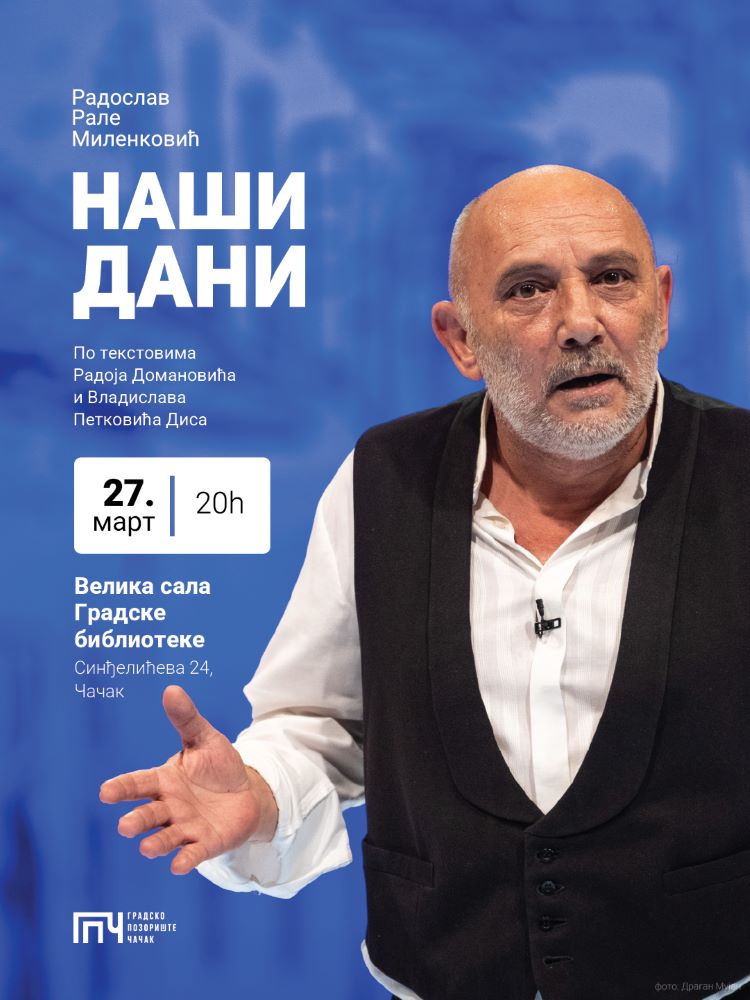 Krajem meseca, u četvrtak, 27. marta u 20 časova, publika će imati priliku da pogleda monodramu “Naši dani“, u izvođenju glumca Radoslava Raleta Milenkovića.